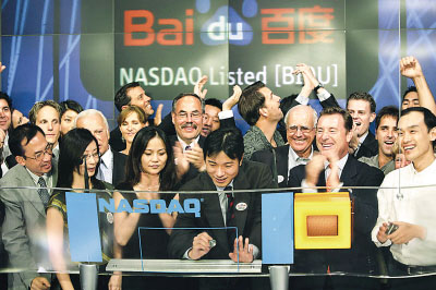 在纳斯达克上市的中国企业中,高级管理层大多拥有海外留学背景。百度创建者李彦宏就曾在美国学习和工作。2005年8月5日,百度在美国纳斯达克成功上市。开盘疯涨超过300%,瞬间最高价格曾达151美元,最终收于122.54美元。图为李彦宏(前排左四)敲响纳斯达克闭市钟。 国新 摄