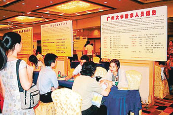 广州留学人才推介会主要定位教育科技专场,邀请的招聘方均为在穗著名高校与科研院所,展会上,海归博士生最受招聘方欢迎,某些紧缺专业博士生甚至被高校当场请回学校参观考察。 宋导 摄(资料照片)