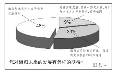 调查显示,近一半的海归希望与本土人才公平竞争,优胜劣汰,显示出对自身实力的强大自信。也有相当一部分海归认为随着国家发展,世界一体化加强,海归与本土人才差别缩小,趋于相同。这说明大部分海归已经充分了解了国内的就业环境,意识到自己拥有的洋学历并不能保证自己创业一定成功。事实上,随着全球经济一体化以及市场经济的进一步完善,所有的市场主体最终要平等地面对竞争和挑战。海归这种良好的心态有助于他们对自己准确定位,提高自身的市场竞争能力,最终更好地适应国内市场。